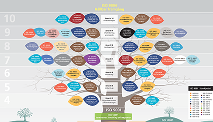 Bild över hur ISO 9001-serien är uppbyggd. Den fortsätter att växa med nya vägledningar och branschspecifika kvalitetsstandarder.